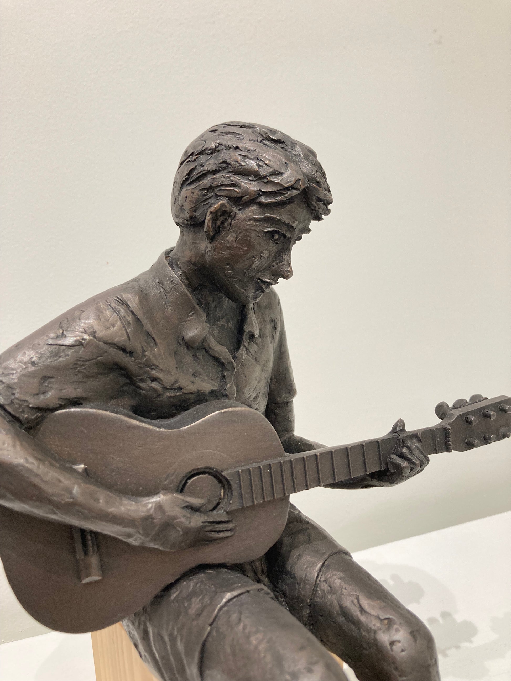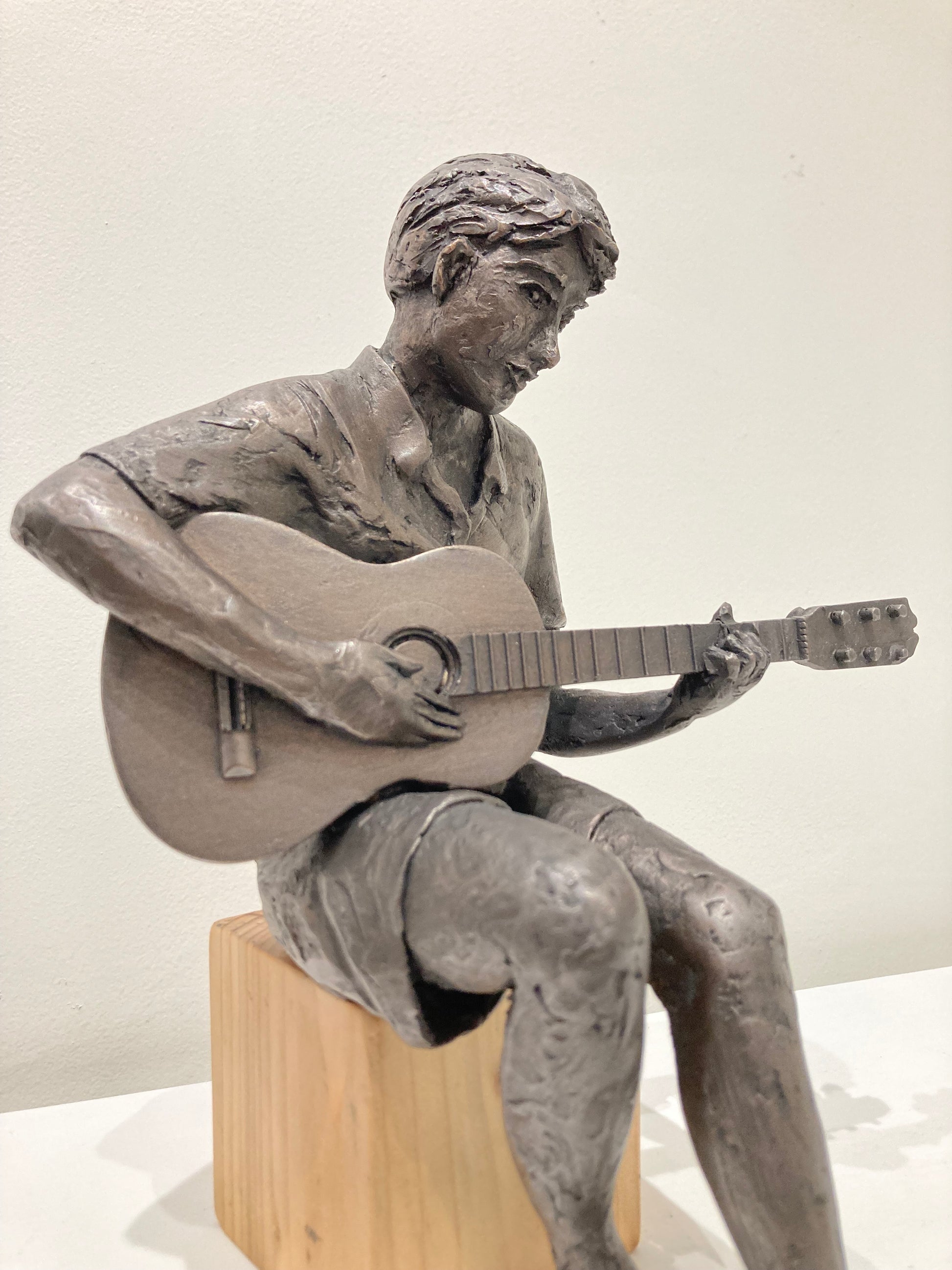 A wonderful sculpture of a boy playing the guitar by Jonathan Sanders in a stunning bronze finish.